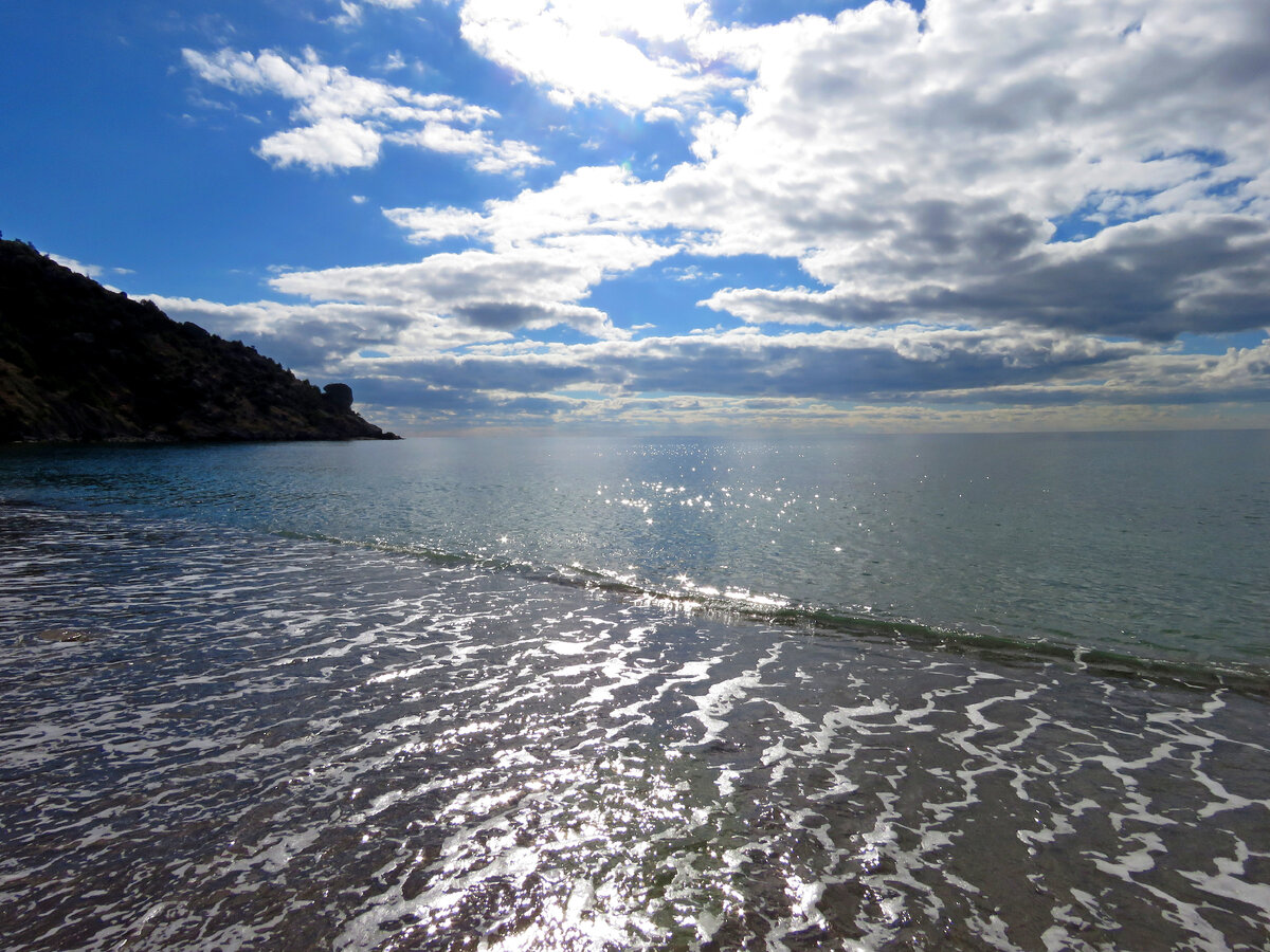 Ура! Машинка вышла с ремонта и теперь можно начинать свои обычные воскресные прогулки в разные стороны Крыма! Не во все сразу, а по очереди))) Но сначала хочется вставить кусочек из стихотворения Вадима Наймана, который в комментариях напечатал Игорь. Они очень хорошо отражают всю суть: Ах, хорошо, едрёна мать, что есть всё это: Корона, Парус, Караул-Оба И даже если защемило что-то где-то Не стОит все же оставаться на бобах.... Нет, хорошо, едрёна мать, что есть все это И море черное, что лучше всех морей И камни серые, что солнышком согреты и морды старые любимейших друзей.... В этот раз захотелось еще поймать тепла на море, и мы поехали в сторону Нового Света, но со стороны с. Веселое. Видео с обзором бухты: Оставив, как обычно машину в Веселовской бухте, по песочку пошли на тропу. Утреннее солнце подсвечивает обрывы горы, усеянные крымской сосной и можжевельником. А красные пятнышки на склоне – это скумпия кожевенная. Она осенью очень красиво меняет цвет листвы. Здесь кустики сов