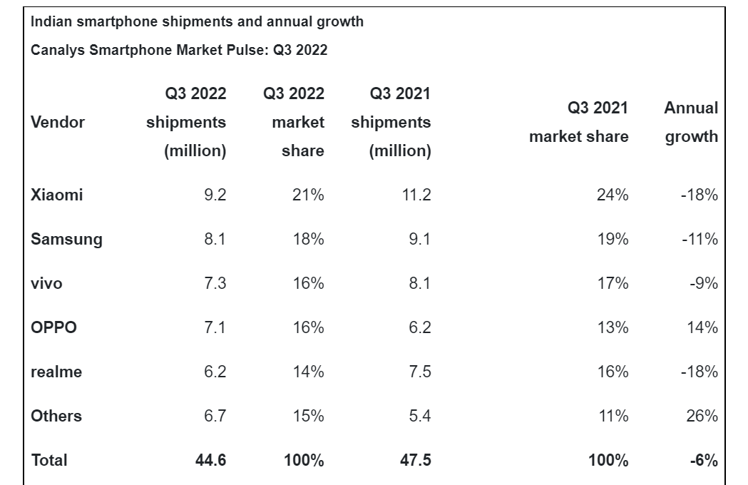 Даже Xiaomi и Realme не смогли сопротивляться тенденциям на рынке смартфонов. Аналитики Canalys оценили рынок смартфонов Индии по итогам третьего квартала текущего года и пришли к выводу, что рынок просел на 6%. При этом в первой пятёрке лишь одна компания смогла нарастить продажи в годовом выражении, и ей оказалась Oppo. Всего в Индии за квартал было реализовано 44,6 млн смартфонов. При этом, если рынок просел на 6%, то почти все компании в первой пятёрке показали более существенный спад. Xiaomi осталась лидером, но её продажи упали на 18%, продажи Samsung просели на 11%, у Vivo показатель составил 9%, а Realme показала себя так же плохо, как и Xiaomi. И только Oppo каким-то образом умудрилась нарастить поставки, причём на 14%. Также стоит отметить, что все остальные компании вне первой пятёрки суммарно нарастили продажи на 26%, то есть покупатели перетекали от лидеров к менее известным брендам. Правда, не только к ним. К примеру, неплохо себя показала OnePlus, да и в целом аналитики