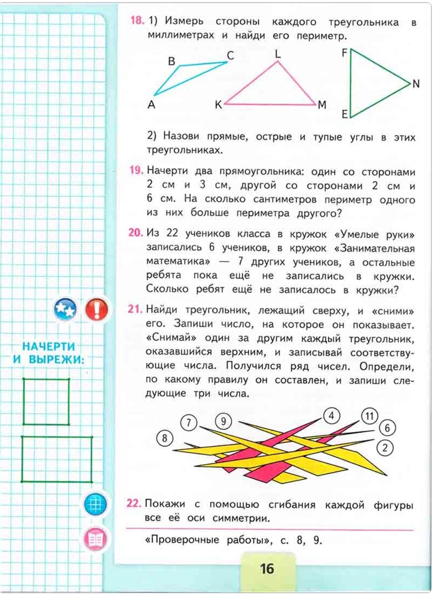 Номер 18. 1) Измерь стороны каждого треугольника в миллиметрах и найди его периметр. 2) Назови прямые, острые и тупые углы в этих треугольниках. Ответ:1) Р1 = 17 + 21 + 35 = 73 мм Р2 = 30 + 25 + 40 = 95 мм Р3 = 30 + 30 + 30 = 90 мм 2) Прямые углы: KLM. Острые углы: BAC, BCA, LKM, LMK, EFN, ENF, FEN. Тупые углы: ABC. Номер 19. Начерти два прямоугольника: один со сторонами 2 см и 3 см, другой со сторонами 2 см и 6 см. На сколько сантиметров периметр одного из них больше периметра другого? Ответ: 1) 2 + 3 + 2 + 3 = 10 (см) – периметр первого прямоугольника. 2) 2 + 6 + 2 + 6 = 16 (см) – периметр второго прямоугольника. 3) 16 − 10 = 6 (см) Ответ: на 6 см периметр второго прямоугольника больше периметра первого прямоугольника. Номер 20. Из 22 учеников класса в кружок «Умелые руки» записались 6 учеников, в кружок «Занимательная математика» – 7 других учеников, а остальные ребята пока еще не записались в кружки. Сколько ребят еще не записалось в кружки? Ответ:Всего – 22 уч. 1