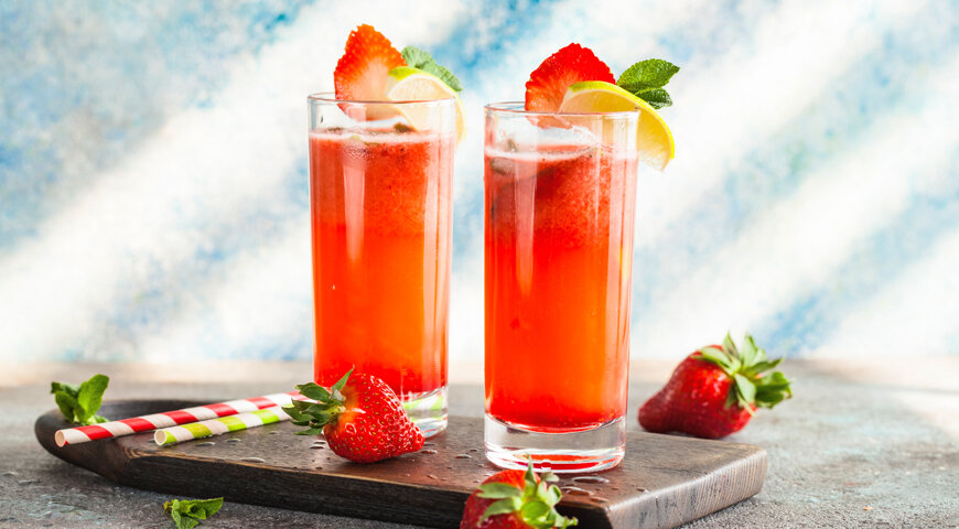 Клубничный мохито! Взрослое слово. А дети так любят подражать старшим! Приготовьте им детский вариант взрослого коктейля – пусть почувствуют себя важными и значительными на собственной вечеринке. А родителям подлейте в тот же коктейль немного золотистого рома и положите побольше льда. Для клубничного мохито готовьте лед из бутилированной воды. ИНГРЕДИЕНТЫ: 600 мл содовой или газированной минеральной воды 200 мл клубничного сиропа 200 мл апельсинового сока, желательно свежевыжатого 2 стакана свежей клубники 1 лайм маленький пучок мяты лед, по желанию Время готовки - 15 мин Количество порций - 4 Количество калорий - 132 ккал БЖУ: 1,6 г / 0,4 г / 30,5 г ПОШАГОВЫЙ РЕЦЕПТ ПРИГОТОВЛЕНИЯ