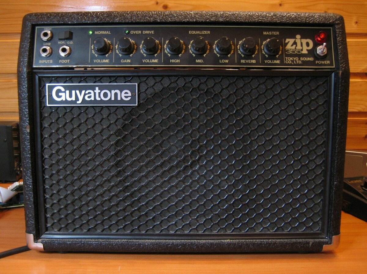 Ремонтируем усилитель Guyatone GA-335, вот такой (фото сделано уже после ремонта): Клиент попросил починить переключатель (на фото - слева наверху), переключатель мы заменим. У переключателя два положения: NOR и O.D. (мне эти названия ни о чём не сказали; мануала на этот усилитель я в сети не нашёл). Чтобы добраться до переключателя, достаём начинку (стрелкой указан виновник торжества с рыжими клавишами): Чтобы его снять, нужно предварительно освободить лицевую панель, фрагмент которой на фото: В панель вставлены светодиоды, но их ноги отломаны. Вынимаем остатки светодиодов: На плате почти никаких следов, куда и как припаивать контакты отломанных светодиодов. Какую роль выполняют эти красные светодиоды? Они подписаны на лицевой панели как Normal и Overdrive - загораются при перегрузке? В наличии у меня оказались зелёные светодиоды, с той же донорской платы, с которой я снимал светодиод для этой педали. Для грамотной пайки замены мне нужна была схема на наш усилитель. В поисках схемы я