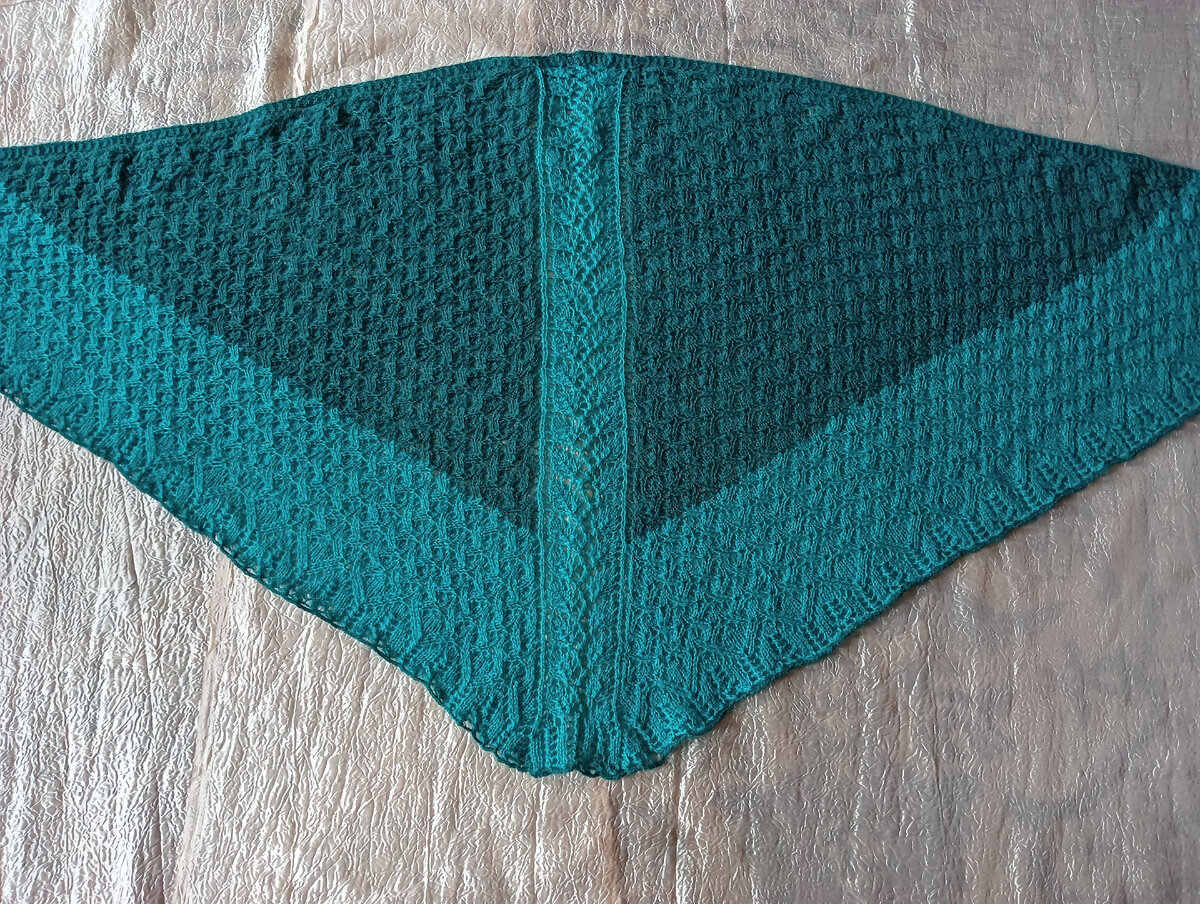 Эта шаль связана из двух цветов со вставкой посередине. Ее размер 2,25 м по длинному краю и 1 м в высоту. Для вязания понадобится 100 г светло зеленой и 100 г темно зеленой пряжи 60% шерсть, 40% акрил (100 г/480 м). Набираем 4 петли и вяжем 32 ряда платочной вязкой. По длине провязанной ленточки в каждом рубчике набираем по 1 петле , и затем 4 петли в набранном крае. На спицах 25 петель. Распределяем их следующим образом: 3 петли платочной вязки, 1 петля треугольника, 17 петель центральной вставки, 1 петля треугольника, 3 петли платочной вязки. Вяжем таким образом до нужного размера, заканчиваем вязание каймой. Вяжем таким образом до нужного размера, заканчиваем вязание каймой. Петли закрываем крючком, провязываем 3 петли вместе, 5 в.п. и т.д. Как соединить нити разного цвета можно посмотреть здесь: Для полной готовности, шаль нужно постирать в теплой воде с мягким моющим средством. Высушить на рамке, а у кого ее нет просто на полотенце аккуратно разложив и закрепив булавкам
