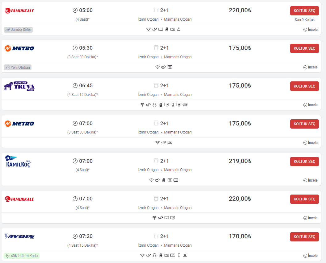 Из Измира мы довольно часто ездим в Мармарис. В этот раз выбрали компанию Metro. Наличие бесплатного трансфера при адекватной цене. Трансфер забирает нас от дома в 5-40, автобус в 7-00. Время в пути 4 часа. Наш район Buca находится достаточно далеко от автовокзала, из-за этого для нас наличие трансфера очень удобная опция. Также бесплатный трансфер предлагают компании Памукале, Камил Коч , Истанбул Калеси (только в дневное время) Но по приезду в otogar нам позвонили, сказали что наш автобус отменён и нам вернут деньги на карту. В итоге выбор пал на İstanbul Kalesi (получилось 170₺ за билет), но и тут не всё так просто, их автобус опоздал на 30 минут!! Приехав в otogar к 6-30 мы уехали в 8-00
