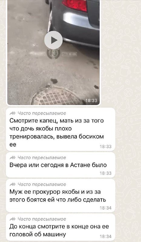 В мессенджере WhatsApp распространялся ролик — в нем женщина тащит за руку девочку, кричит на нее, а потом изо всех сил толкает на машину и ребенок ударяется головой. Видео снято проходившей мимо девушкой, которая попыталась успокоить женщину и остановить избиение. Еще в рассылке было сказано, что женщине ничего не будет, поскольку она родственница сотрудника прокуратуры и он ее обязательно «отмажет». По информации журналиста Михаила Козачкова, в видеоролике жена сотрудника генпрокуратуры Кадыржана Маматаева – Алмагуль и ее дочь гимнастка Аяла. Отец-прокурор считает, что все «раздуто». МВД начали расследование, а женщина отделалась штрафом МВД отреагировал на запрос журналистки Жанны Ахметовой и сообщил о расследовании. Журналисту Козачкову удалось побеседовать с самим сотрудником генпрокуратуры. Маматаев признал, что на видео его дочь. Он также рассказал, что не считает это избиением. — Это не избиение. Вы же сами видели видео – она локтем там… Вчера комиссия из акимата смотрела, вся