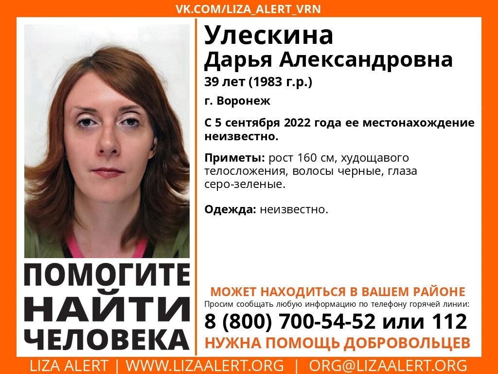 В Воронеже пропала 39-летняя женщина Дарья Улескина. Её местонахождение неизвестно с 5 сентября. Об сообщают в поисково-спасательном отряде «Лиза Алерт». Воронежцев просят помочь с поисками: - Если вы обладаете какой-либо информацией о пропавшей, просьба позвонить по номеру телефона горячей линии отряда 88007005452 (бесплатно по РФ) или 112, - просят волонтёры. Рост пропавшей 160 сантиметров, худощавое телосложение, чёрные волосы и серо-зеленые глаза. Во что была одета женщина в день исчезновения неизвестно.