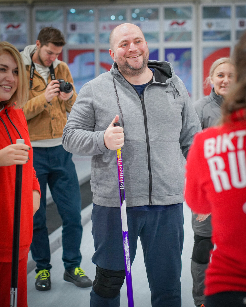 До этого дня кёрлинг ассоциировался у меня со словами главного тренера нашей сборной, которые она сказала президенту Путину в ответ на вопрос о готовности команды: «Всё хорошо, все девочки красивые!». Женская сборная по кёрлингу и правда у нас наполнена девушками, словно сошедшими с обложек глянцевых журналов. Одна из них — Алина Биктимирова, с которой мы познакомились в новой социальной сети ТенЧат и периодически кидались смайлами на сторисы друг друга. Поделился с Алиной давай мечтой поиграть в кёрлинг или хотя бы просто посмотреть как играют профессионалы. Спустя две недели после этого мне приходит сообщение с приглашением: «Вы мне первый написали про кёрлинг, когда я сюда пришла». И вот семья в составе: я, Маша и Александрина прибыли в район Марьиной рощи в кёрлинг-клуб «Новая лига». А там — куча незнакомых знакомых из ТенЧата, аж на четыре команды. Стоят кружком, знакомятся. Выдали ботинки. Обувь здесь специальная — один ботинок со скользкой тефлоновой подошвой, другой нет. На ско