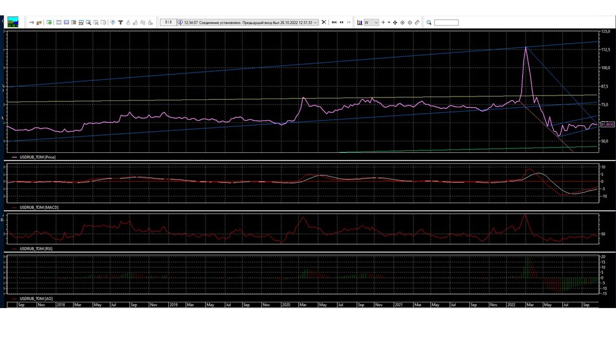 В среду находясь на уровне 61,0 уходит вниз и до конца недели застревает в коридоре 59,0-60,0.