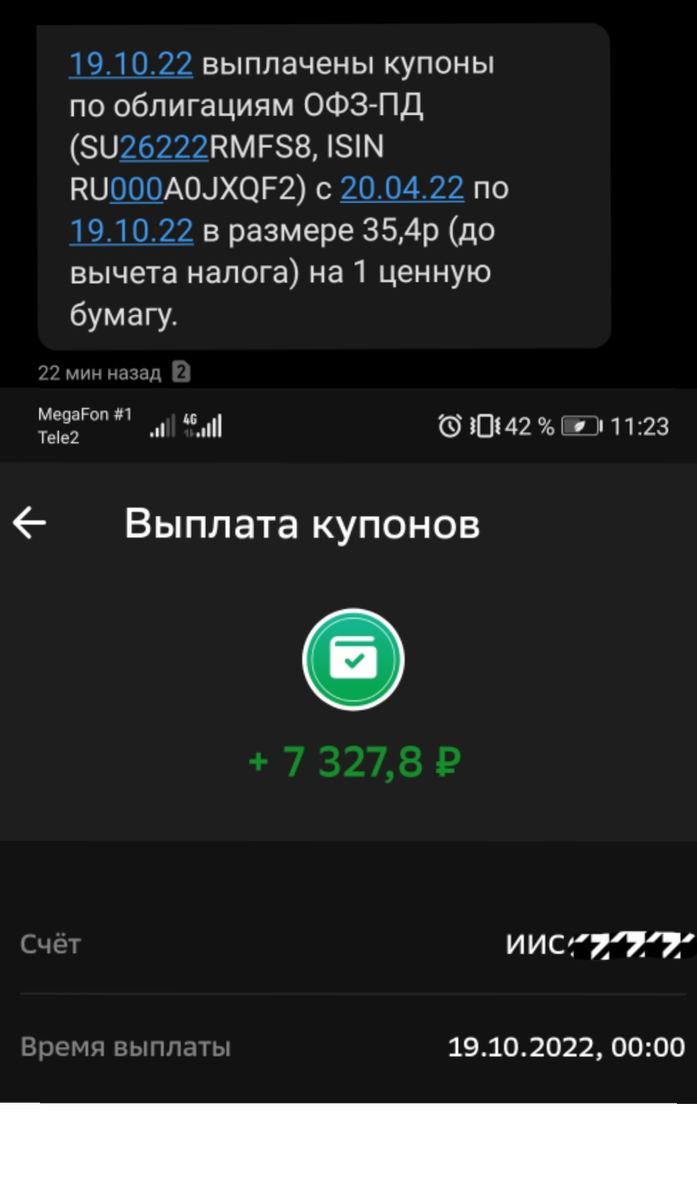 Получил октябрьские выплаты по ОФЗ 26222 (207 шт.) в размере 7 327,8 руб. до вычета: