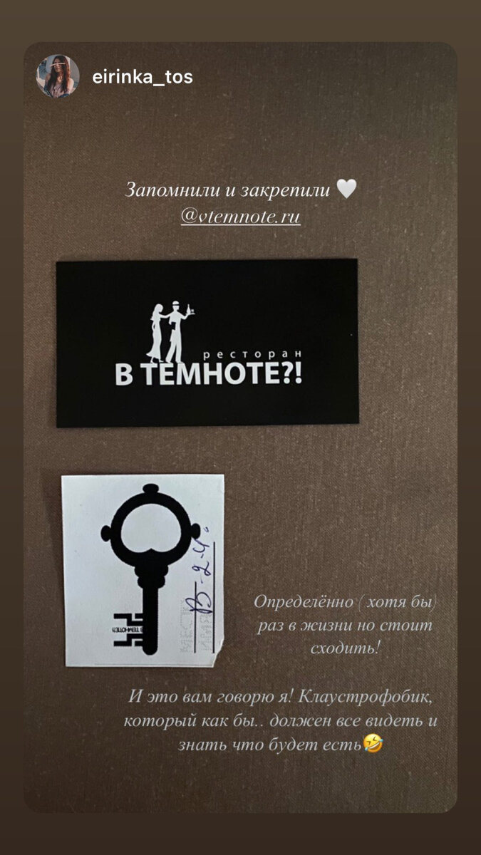 А если вы еще не были у нас в гостях, то в нашем аккаунте VK (https://vk.com/vtemnote_ru) в разделе «Меню» вы можете ознакомиться с концепцией ресторана и тем, как именно проходит сеанс в кромешной темноте✨