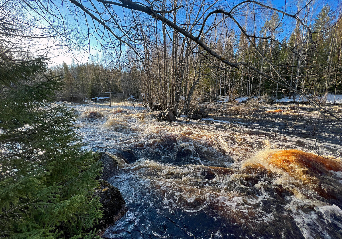 В этом году, весной, мы собрались смотреть на Уксинскую гряду, но весна в Карелии припозднилась, потому на гряду мы не попали. Зато везде бурлили реки, и мы решили, что самое время посетить водопад Белые Мосты (Юканкоски). Я как раз увидела заметку, что это место собираются развивать так же, как и Мраморный карьер. Вот мы и решили, что пока там еще нет толп народа – надо проведать красивое место. Прекрасно помня дорогу, мы не особо опасались, что до водопада не доедем – машина высокая, да и дорога была (в прошлые годы) вполне приличная. Но в этот раз сюрприз нас ожидал гораздо раньше. Сначала я увидела, что на берегу озера Руокоярви появились строения. Пока немного, пара домов, но видно было, что стройка началась недавно. Судя по всему – строят турбазу. А почти сразу после озера, за пару километров до того места, где все раньше оставляли машины, появилась большая парковка... а вот дорога дальше - исчезла. Вместо нее мы смотрели на глубокую колею от огромных колес, лужи и грязь... Мы сн