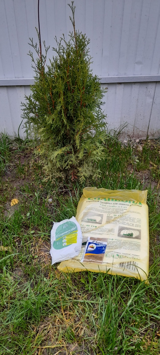 В подготовке к зиме нуждаются все без исключения растения сегодня я расскажу вам ,как я готовлю свой сад к зиме! В данном случаи расскажу Вам про туи. Начало сезона укрытия садовых растений всегда приходится на середину осени,обычно я это делаю в конце октября. Что я использую: Спанбонд Суперфосфа Хорус По этапам 1.Проводим тщательную чистку растения, в том числе удаление сухих листьев, обрезаю больные ветки. 2.Профилактические меры по борьбе с заболеваниями и вредителями в моем случаи я использую Хорус- от болезней плодовых культур(также подходит и для хвойных деревьев) 2г разводим на 10л воды и тщательно обрабатываем дерево(прощу заметить работу выполняем в "сухой" не дождливый день) 3.Следующим этапом удобряем ,я люблю суперфосфа -стимулирует рост корневой системы и клубней, формулирует устойчивой к заболеванием. 1 ст.л на корень. 4.И в завершении в один слой утепляем или правильнее сказать защищаем от солнца туи при помощи спандонда-укрывной материал для защиты растений(ещё е