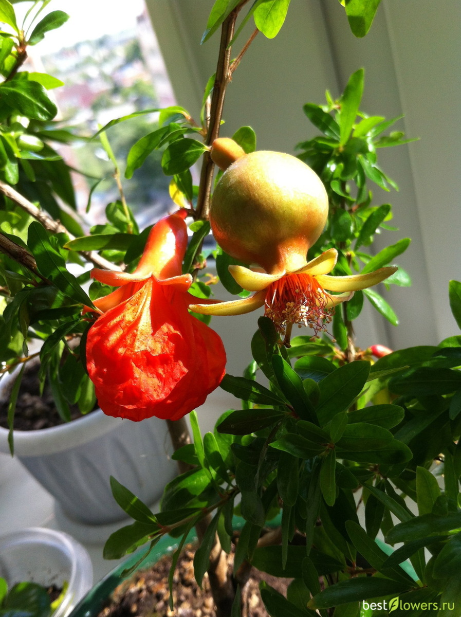 Замечательно растут в домашних условиях декоративные гранаты и карликовые формы садовых гранатов. Гранаты карликовой формы цветут так же необыкновенно, как декоративные, но ещё и дают плоды. Цветение продолжается с весны до поздней осени. В обычных горшках растение достигает метровой высоты. Декоративные гранаты тоже довольно высокие, почти не имеют шипов, отличаются нарядными цветками. В искусственных условиях цветение начинается на третий-пятый год. Цветёт гранат в июле-августе. Очень красивы сорта декоративного граната Легреллия с махровыми жёлто-красными цветками. Сорт Нана - небольшое растение (до 1 м.), цветущее почти весь год алыми или оранжево-красными цветками.