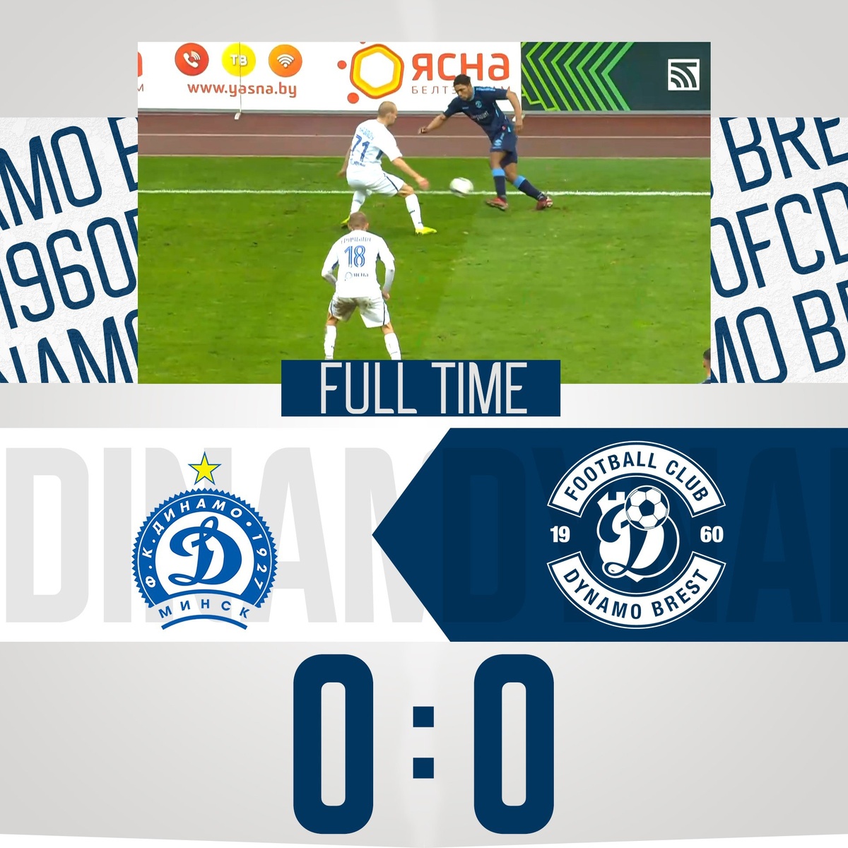 Минское и брестское "Динамо" сыграли вничью в матче 27-го тура чемпионата страны — 0:0. Столичное "Динамо" с 52 очками идет вторым в таблице, у брестчан 24 балла и 13-я позиция. ДИНАМО Мн — ДИНАМО Бр — 0:0 Минск. 23 октября. Стадион "Динамо". 15.00. 2811 зрителей. Судьи — П.Коронец, В.Фомин, В.Русак (все — Жодино). ДИНАМО Мн: Шпаковский — Быков, Йосипович (Ложкин, 65), Бахар, Гречихо, Кисляк (к) (Латыхов, 85), Сачивко, Ориньо, Козлов (Бегунов, 88), Концевой, Игор Габриэль. Запасные: Хаткевич, Швецов, Ховалко, Демченко, Наумов, Вакулич. ДИНАМО Бр: Козакевич — Гарананга, Мирошников, Цепенков (Куадьо, 83), Шестюк (Артемчук, 65), Щербо, Шемрук, Олехнович (к), Гордейчук, Иван (Опамойе, 70), Юдчиц. Запасные: Третьяк, Ковальчук, Ковалюк, Ясюкевич, Кривицкий, Богданович, Лынько. ПРЕДУПРЕЖДЕНИЯ: Шестюк (40), Опамойе (81), Козлов (86). Фото: vk.com/dynamobrest
