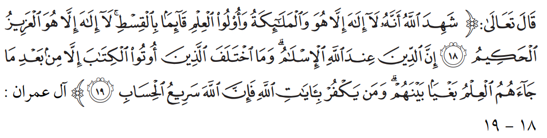 «Всевышний Аллах открыл, разъяснил людям достоверными, ясными доводами, что поистине нет никого достойного поклонения, кому обязаны поклоняться, кроме Него самого. Ангелы, увидев Его величие и могущество, тоже засвидетельствовали, признавая, что Аллах один, и повинуясь Ему. А также пророки, ‘алимы, правоверные засвидетельствовали, что нет божества, достойного поклонения, кому следует поклоняться, кроме Всевышнего Аллаха, подтвердив это сердцем и признавая устами».