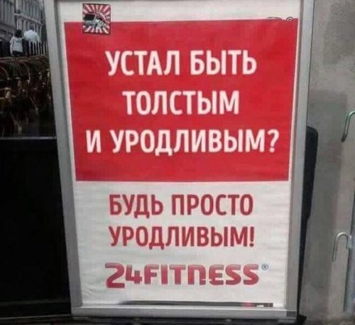 Добрый день (вечер, ночь, утро) Всех нас окружает реклама. Она просто повсюду и от нее никуда не деться, даже если вы не смотрите телевизор и не выходите из дома. И вы наверняка встречали такую рекламу, которая просто ставила вас в ступор и единственное, что вы смогли подумать "Что я сейчас прочитал/посмотрел" .Сегодня я решил показать самых божественных маркетологов и их шедевры Что-то меня это не сильно мотивирует)) А если в зал ходить не меньше года то вам в лицо больше не осмелятся сказать, что ты урод А можно не надо. Мне и пацаном не плохо живется. Ааа вы не про это... Эта реклама кроме смеха у меня ничего не вызывает) Это действительно гениально А еще на таком брелоке можно написать где у вас хранятся деньги, какой пароль на компьютере. Ну, что бы, когда придет нашедший ему было не скучно ждать вас. Иногда нам мягко намекают на что-то. Осталось понять на что А от некоторой рекламы так и веет домашним теплом и уютом) Ну а что, когда заснешь на Сочинском пляже еще и не таким верне