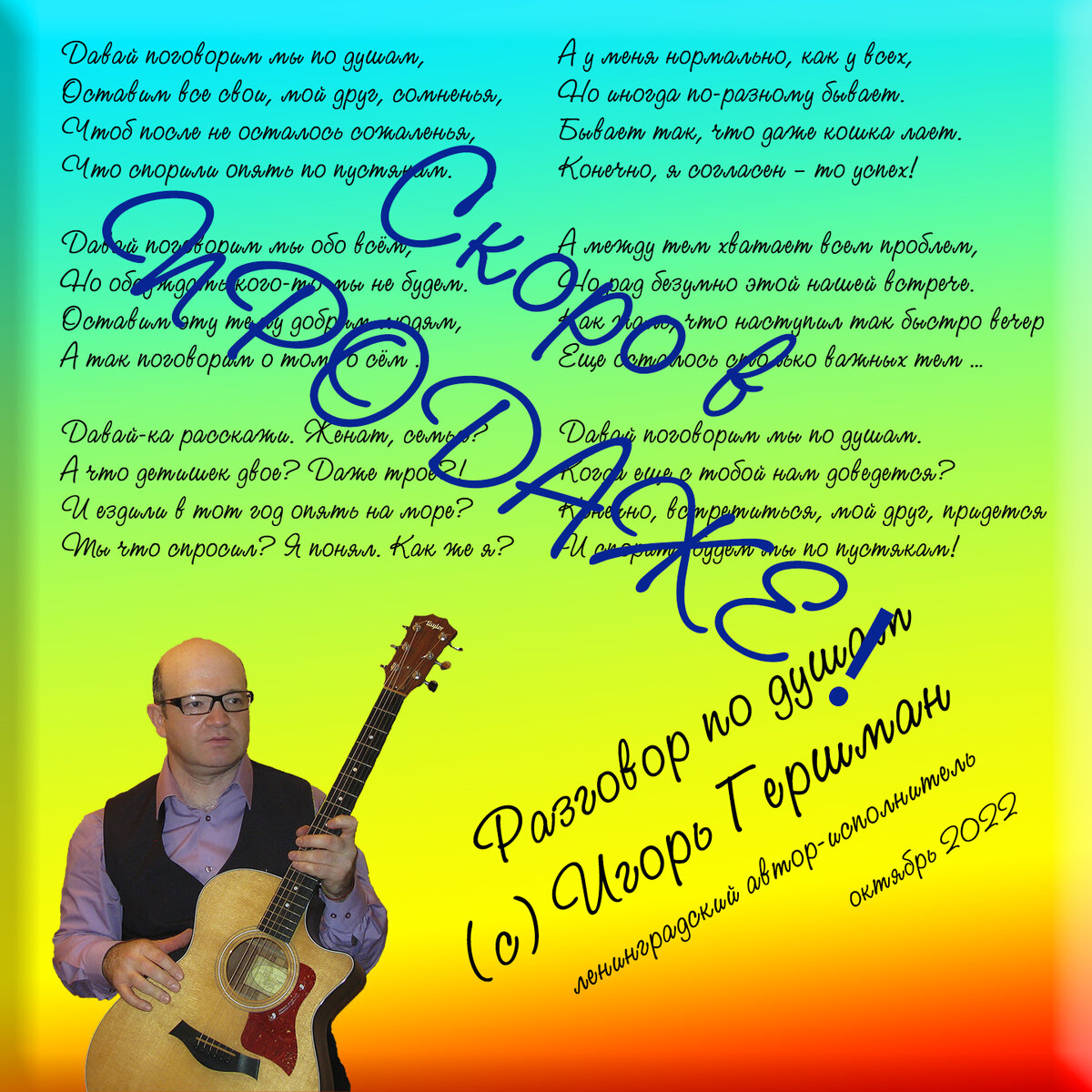 … и снова здравствуйте! Спешу поделиться отличной новостью со своими постоянными слушателями. Наконец-то закончена работа над новым музыкальным CD “Разговор по душам”. Диск получен из производства и поступит в продажу после онЛайн-концерта презентации, который состоится в ближайшее время. По крайней мере, до конца октября. О дате проведения онЛайн-концерта будет сообщено дополнительно. Так что следим за новостями. Каким получился диск? Судить мне сложно, но думаю, что он не хуже предыдущих. Впрочем, послушаете и сами поделитесь своими впечатлениями. Продолжительность диска: 44,51 мин. В диск вошли следующие песни: 1. Бой с Драконом 3.42 2. В лето два шага 2.30 3. Между Ангелом и Бесом 1.36 4. Зимушка-зима 2.50 5. Советы 3.12 6. Всё в мире относительно 3.33 7. Разговор по душам 1.59 8. Юбилей ЛИАП/ГААП/ГУАП 2.45 9. Стерва 1.51 10. Мы теряем, нас теряют 2.03 11. Письмо с войны 3.35 12. Реквием по погибшим 3.46 13. Заставляю себя 1.12 14. Колыбельная для взрослых 2.02 15. Реанимация 3.53