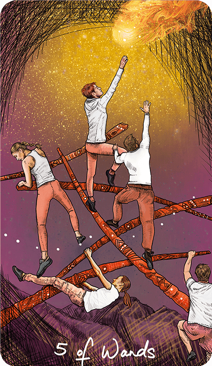 5 жезлов Сегодня вам придется оказаться в ситуации экзамена, испытания или вызова. Речь может идти о конкуренции, противоборстве двух мнений или о психологическом состязании и выяснении отношений. Аккумулируйте свои силы в честной борьбе с полной отдачей, но помните, азарт иногда превращается в спор, и это становится опасно. РАБОТА И ФИНАНСЫ: 5 ЖЕЗЛОВ это борьба за отстаивание собственных интересов, масса разногласий, шанс сравнить свои способности с возможностями других. Аркан может означать вмешательство посторонних в ваши дела, перемены, кадровые перестановки, пустые хлопоты и беготню. Вот для обучения, экзаменов, физической и профподготовки карта благоприятная. ЛИЧНЫЕ ВЗАИМООТНОШЕНИЯ: в устоявшуюся семейную жизнь карта вносит разнообразие, перемены, динамику и неуправляемость. Ссоры могут разгораться по любому поводу, подогреваясь амбициями и желанием что-то доказать. Карта указывает на эгоизм, упрямство, ревность и нежелание уступать.