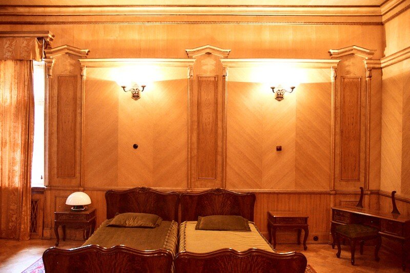 Э: Во всех спальных комнатах вам будет встречаться по две кровати. Это из-за матрасов. Матрасы были привезены из Германии, они состояли из морских водорослей и конского волоса. Считалось, что наполнение конским волосом может иметь пуленепробиваемый эффект. Матрасы тогда не умели делать двуспальными. Поэтому здесь кровати двойные.