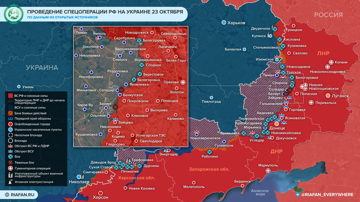 Уничтожено пять складов боеприпасов ВСУ, нефтехранилище с дизельным топливом для военной техники ВСУ и склад горючего, на котором хранилось более 100 тысяч тонн авиационного топлива для воздушных сил Украины. Средствами ПВО за сутки сбиты 15 украинских БПЛА. Кроме того, в воздухе уничтожено шесть снарядов РСЗО «HIMARS» и одна противорадиолокационная ракета «HARM». Ударами российской авиации и сосредоточенным огнем российской артиллерии с заранее подготовленных рубежей подразделениям ВСУ нанесено огневое поражение. Уничтожено около 70 украинских военнослужащих, три боевые машины пехоты, семь бронетранспортеров и три пикапа. Авдеевское и Кураховское направления. Враг атаковал наши позиции силами двух ротных тактических групп, усиленных тан