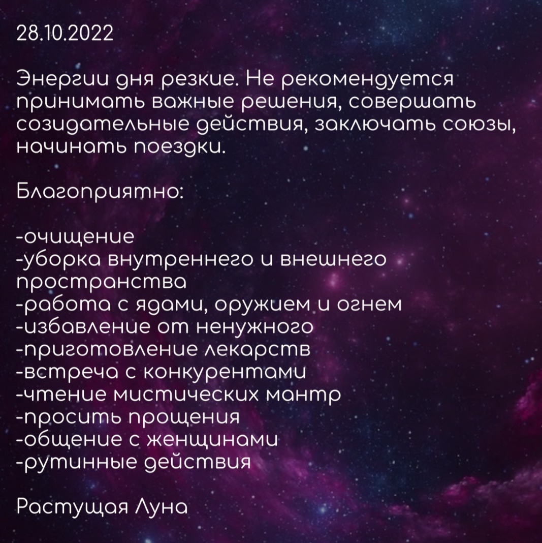 Энергии дня резкие. Не рекомендуется принимать важные решения, совершать созидательные действия, заключать союзы, начинать поездки. Благоприятно: -очищение -уборка внутреннего и внешнего пространства -работа с ядами оружием и огнем -избавление от ненужного -приготовление лекарств -встреча с конкурентами -чтение мистических мантр -просить прощения -общение с женщинами -рутинные действия Растущая Луна #дарьяvidvas #астрологический прогноз #астрологический прогноз на неделю #астрологический прогноз на сегодня #астрологический прогноз на день #астрологический календарь