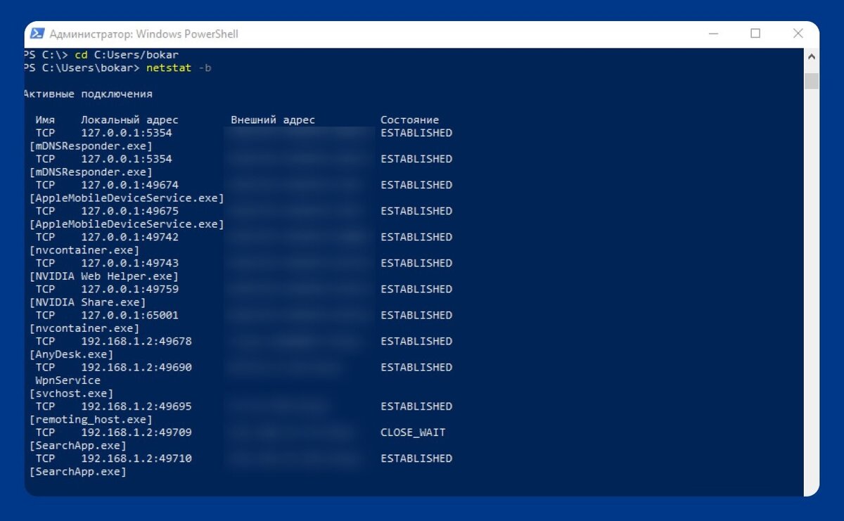 Иногда у пользователя ПК могут появиться подозрения, что с его компьютером что-то не так. К примеру: внезапное открытие или закрытие программ, посторонние вкладки, частые взломы аккаунтов и прочее. Одной из причин таких явлений может стать вирус удаленного доступа. Чтобы найти вирус: 1. Запустите командную строку от имени администратора. Удобно открыть через ПКМ на иконку «Пуск». 2. Перейдите в директорию своего юзера, используя команду «cd C:\Users\<ваш_юзернейм>». 3. Введите команду «netstat -b». На экран начнут выводиться все подключения ваших программ, а так же их IP-адреса. 4. Если нашли незнакомый подозрительный процесс, введите команду «netstat -nbo», чтобы узнать PID этого процесса. 5. Затем выполните команду «taskkill /PID <pid_вашего_процесса> /F», чтобы убить процесс. В случае обнаружения вируса вы также увидите IP адрес прокси сервера, через который он имеет доступ к компьютеру. Это может оказаться полезным.