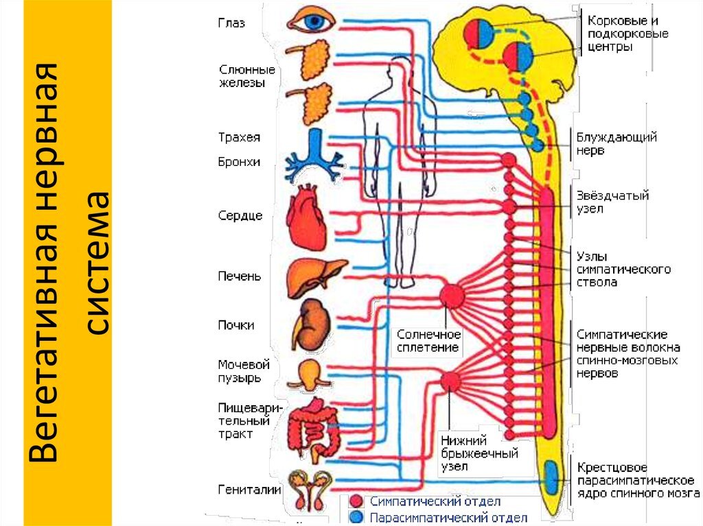 Попытаюсь как можно проще рассказать вам про вегетативную нервную систему. В состав ВНС входит ствол, который проходит вдоль позвоночного столба. Этот свол состоит из скоплений нервных узлов, от которых в свою очередь отходят нервные волокна к сосудам и внутренним органам. Через них и происходит воздействие на органы или иннервация органов. Вы можете убедиться в этом, рассмотрев картинку. В древности мудрецы называли эти узлы "чакрами". И сейчас есть последователи магических учений, которые, не вдаваясь в постулаты доказательной медицины, предлагают лечить вегетативную активность дыханием в "чакры" или, наполняя их светом. Вегетативная нервная система регулирует все внутренние процессы организма: функции внутренних органов и систем, желез, кровеносных и лимфатических сосудов, мускулатуры и органов чувств. Вдумайтесь, ВНС затрагивает работу всего организма! Вот поэтому, когда усиливается активность вегетативной нервной системы, человек начинает испытывать широкий спектр вегетати