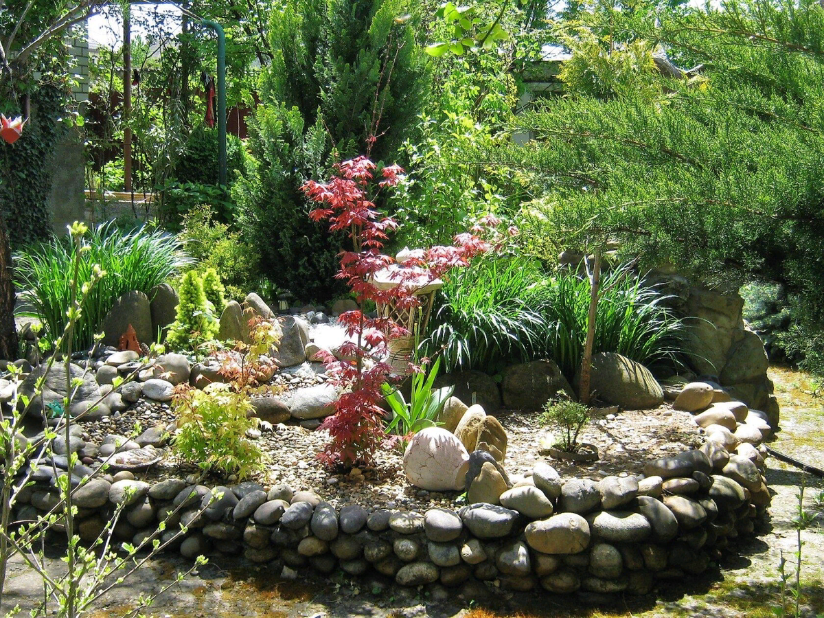 В предыдущей статье из истории моего сада за 2012 год, пошла дискуссия, красиво это или нет, использовать в саду камни. В моём саду камней много. Сад на 20 сотках, камни использованы в нескольких местах сада. Это горка. Так я её сделала ещё в 2010 г и каждый год переделывала какие- то элементы. По периметру горка обложена камнями на раствор. А сверху можно менять как угодно. Хоть каждый год, но надо учитывать, что на горке растут хвойные растения и многолетние цветы. И ещё эта горка скрывает септик. Это чисто техническое устройство в пяти метрах от дома. Септик был накрыт большой бетонной плитой и её надо было как- то замаскировать. Попросила тракториста, когда перепахивали участок, нагрести в это место кучу земли. Он конечно же удивился, сказал, что все участки разравнивают, а мне понадобилась куча земли. Так возникла эта горка. В бетонной плите есть металлический люк, который можно открыть в любое время. Он так же замаскирован камнями. Так был замаскирован люк в 2011 год