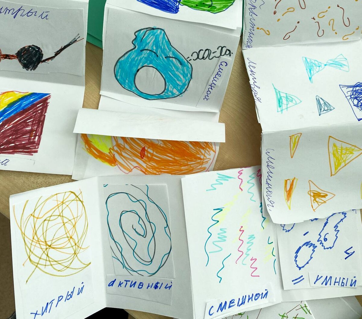 - после этого ученик подписывает заготовку книги (сложённая гармошкой половина А4) и вклеивает свои рисунки