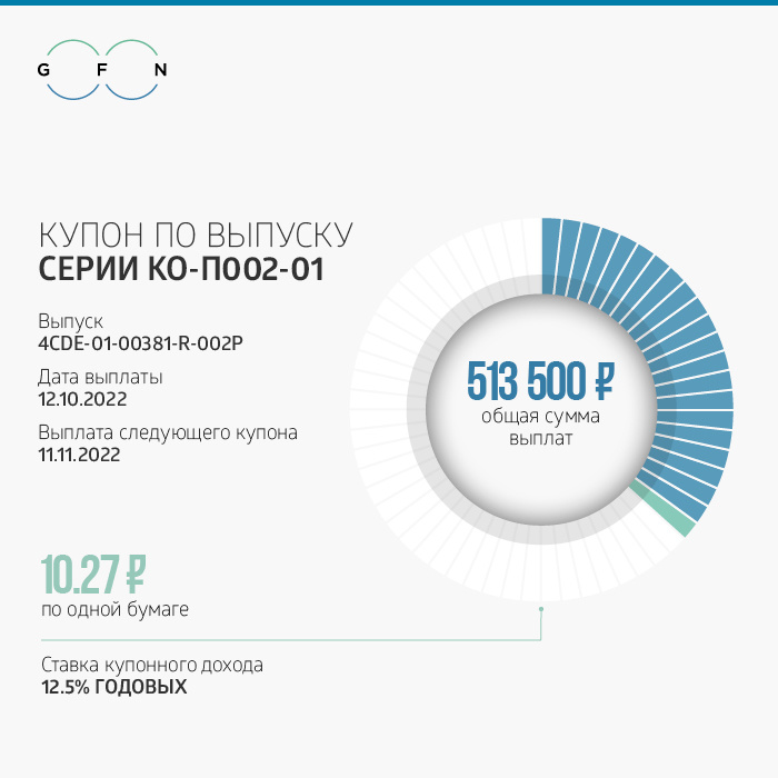 Инвесторы получили перечисленный эмитентом купонный доход в размере 12,5%, 16% и 20% годовых по четырем выпускам коммерческих облигаций. Купонные выплаты по выпуску серии КО-П002-01 начисляются из расчета 12,5% годовых. Общая сумма выплат по выпуску составляет 513 500 рублей, по одной бумаге — 10,27 рубля. Выпуск коммерческих облигаций серии КО-П002-01 (4CDE-01-00381-R-002P) объемом 50 млн рублей был размещен эмитентом по закрытой подписке в декабре 2020 г. сроком на пять лет. Номинал одной облигации — 1000 рублей. В настоящее время в обращении находится все 50 тыс. ценных бумаг выпуска. По выпуску предусмотрено 60 ежемесячных купонов. Купонные выплаты по выпуску серии КО-П002-02 начисляются из расчета 12,5% годовых. Общая сумма выплат по выпуску составляет 575 120 рублей, по одной бумаге — 10,27 рубля. Пятилетний выпуск коммерческих облигаций серии КО-П002-02 (4CDE-02-00381-R-002P) размещается эмитентом по закрытой подписке с 25 февраля 2021 г. Номинал одной облигации — 1000 рублей. В