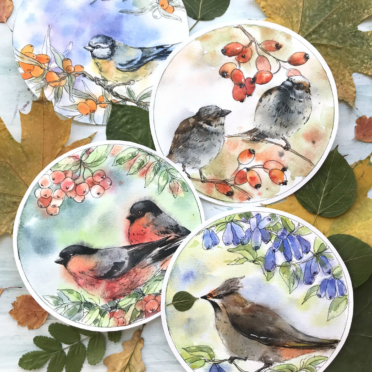 — нахохленных свиристелей на веточках жимолости.