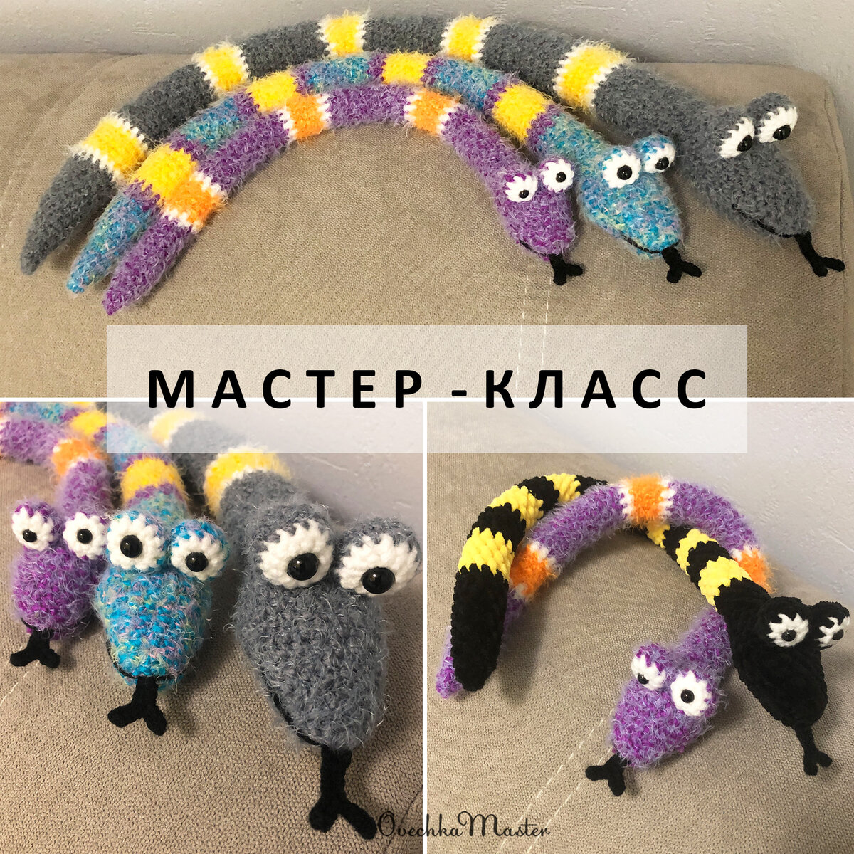Добрый день. Многие вяжут плюшевых змеек, а я как всегда творю чудиков. Сделала подробное описание. В мастер-классе использована пряжа «Травка» 80 м / 50 г. Но в целом схемка универсальная, подойдет для любой пряжи. Отлично подойдет и плюшевая пряжа с похожими характеристиками (например, Wolans Bunny Sweather 160 м / 100 г, YarnArt Dolce Baby 85 м / 50 г и другие). В общем пряжу можно использовать любую, но размер игрушек может отличаться. Я как всегда взвешивала пряжу, чтобы было понимание сколько уходит пряжи на ту или иную игрушку. Понятно, что плотность вязания у всех разная, да и крючок может быть подобран другой... Тем не менее примерное понимание по расходу пряжи все равно будет. Вязала из пряжи Камтекс Травка Стрейч (80 м / 50 г) крючком 3,5 мм. Итак, длина самой большой змеи примерно 64 см и на нее ушло около 78 г (это я суммировала все 3 цвета). Длина средней змейки примерно 50 см и на нее ушло 43 г (в сумме 3 цвета). Маленькая змея из травки длиной примерно 40 см и на не
