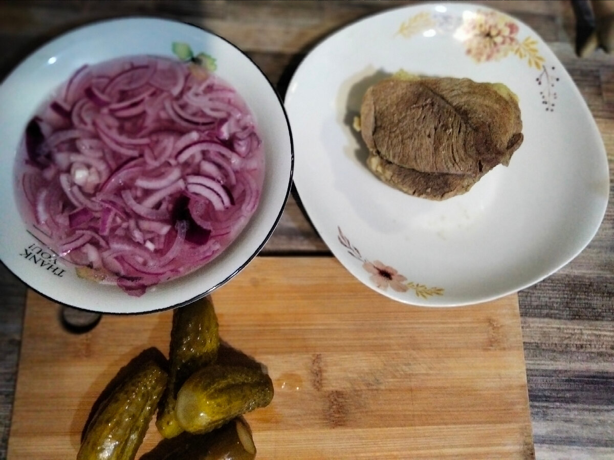 Здравствуйте! На меня напала ностальгия, еле отбилась салатом из детства. Он готовился у нас довольно часто и просто так, и по случаю гостей. Особенно актуален был в новогодние, когда гости идут за гостями, и нужно чем-то их угощать. В качестве закуски говорят хорошо идёт) Взяла всего три ингредиента: Вместо свинины вполне можно взять говядину, а вот с курицей получается совсем не то. Раньше, во времена отсутствия красного лука, использовался белый, получается не хуже. Лук я нарезала тонко полукольцами, добавила немного уксуса и залила кипятком на несколько минут. Мясо отварила с лавровым листом и солью до готовности. Мясо и огурчики нарезала тонкой соломкой, лук откинула на дуршлаг. Всё смешала. В качестве заправки использовала смесь майонеза и кетчупа, в простонародье кеченез. Буквально по ложке на такое количество продуктов. Можно ещё приправить черным молотым перцем но у меня и так огурцы ядреные, не стала. Всё. Собрать салат дело нескольких минут, если мясо предварительно отварить