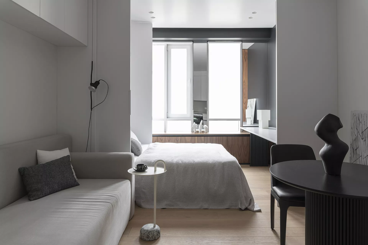 Дизайнер Наталия Рыбакова создала проект для молодого мужчины, работающего в сфере IT. Квартира-студия площадью 29,9 кв. метра находится в ЖК Headliner. «Перед началом работы заказчик четко обозначил свои требования к будущему интерьеру, вспоминает она. — Пространство должно быть аскетичным, спокойным, с максимальным количеством хранения. Это была очень интересная задача для такой небольшой площади». «Мы использовали планировку от застройщика. Ванная комната совсем небольшая по площади, 2,9 кв. метра, но в ней удалось разместить и душевую, и прачечную. Остальное пространство также четко зонировано: прихожая, кухня, столовая, гостиная, спальня, кабинет. Каждое помещение имеет свои визуальные границы — это было одним из основных пожеланий клиента. Естественно, необходимо было применять элементы трансформации: мы выбрали откидную кровать, а также диван, часть которого выдвигается для большой компании». Студия вытянутой формы привлекла будущего владельца хорошей освещенностью благодаря дву