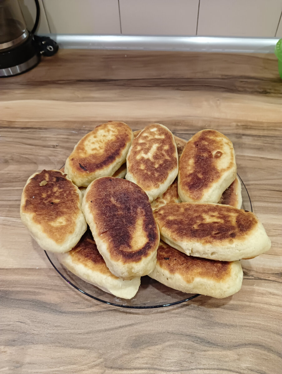 Румяные, пышные и лёгкие в изготовлении пирожки. Не нужно ждать пока тесто взойдёт или вымешивать его 20 минут. Они готовятся очень быстро. Начинка для этих пирожков подойдёт любая, я буду использовать яблочное повидло Для приготовления нам потребуется В слегка подогретый кефир добавьте соль, сахар и соду. Дайте соду войти в реакцию с кефиром. Постепенно добавьте кефир к муке, замесите тесто. Тесто должно получится мягким и слегка прилипать к рукам. Разделите тесто на 12 шариков. Можете поставить разогреваться сковородку. Раскатайте шарик в пласт теста и выкладывайте начинку в середину пласта. Защипните края теста в пирожок Выкладывайте пирожки на разогретую сковороду. Готовьте на ниже среднего огне при закрытой крышке по 5 минут, переверните и на второй стороне 3 минуты. Жаренные пирожки с начинкой готовы. Приятного аппетита!
