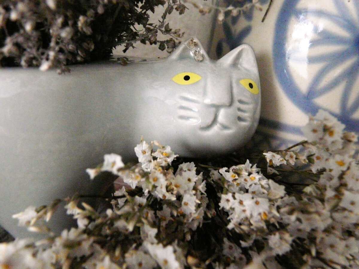 Для композиции «Осень цвета полыни» мне пригодились разные предметы декора: стеклянные вазы-колбы, кашпо в виде кота, купленное в известном магазине недорогих товаров, ретро-ваза (её мне подарила коллега), горшки с суккулентами. Декоративная птичья клетка – это подсвечник, баночки с крымской лавандой тоже украшены фигурками птиц. Маленькие тарелочки и солонка с крышечкой (клеймо "ЗиК") куплены на блошином рынке.