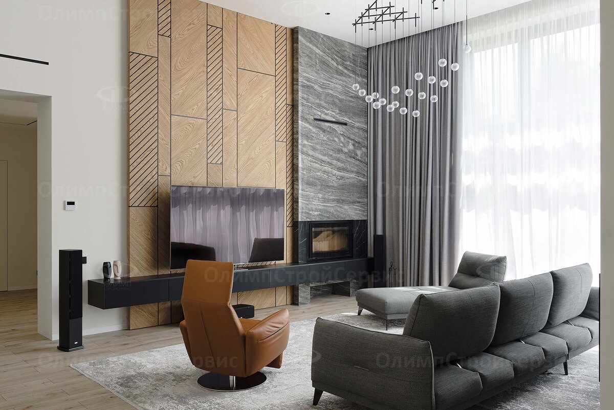 При создании гостиной были использованы природные цвета – теплые и нейтральные. Здесь преобладает серый оттенок, который отлично сочетается с песочным и бежевым. Отличным акцентом в комнате стало уютное вращающееся кресло терракотового цвета. Оно превосходно дополняет серую мягкую мебель, напротив которой расположился современный камин.