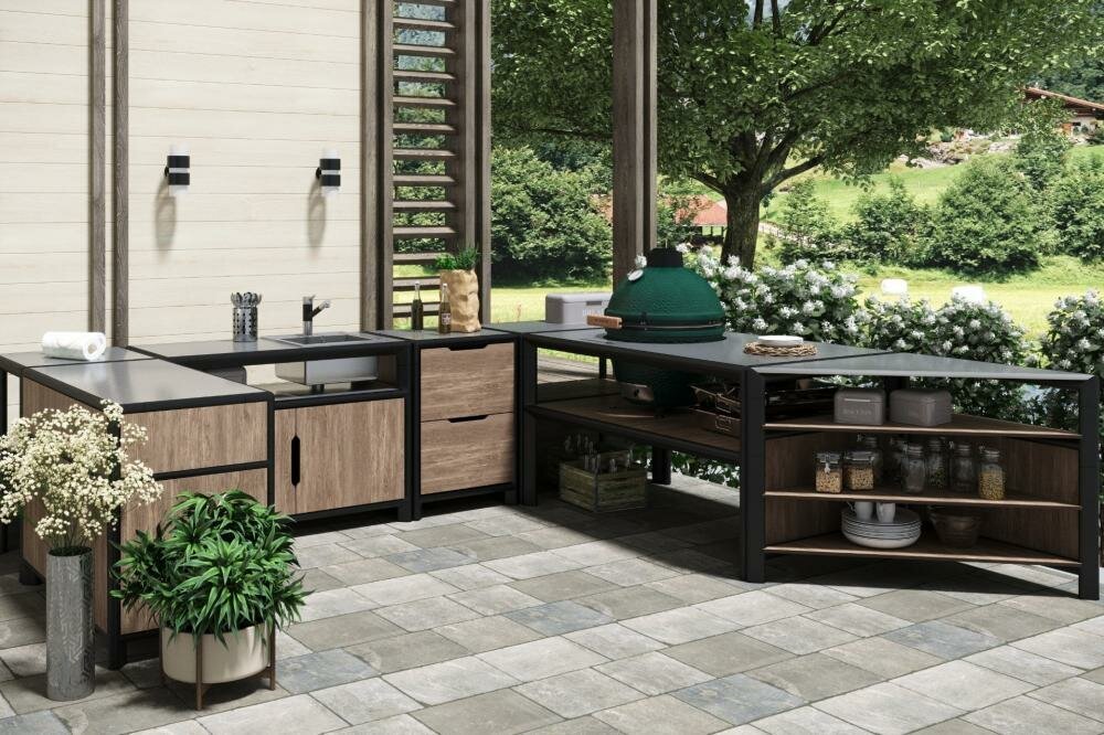 Комбинированная кухня — успешная альтернатива первым двум вариантам, которая объединила их преимущества. Вы по-прежнему остаетесь на свежем воздухе, но помещение уже не продувается со всех сторон, поскольку одной стороной кухня примыкает к зданию. С помощью двух каменных стен вы можете создать угловую постройку.