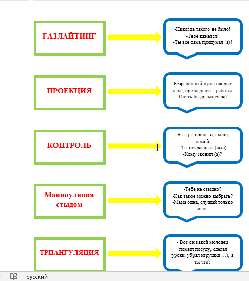 краткие УРОКИ про МАНИПУЛЯЦИИ 2 А теперь остановимся на видах манипуляций. Авторами виды раскрываются по-разному. Мне понравилась классификация, представленная на сайте https://psylib-org. Примеры я приводила свои, интерпретировала основываясь на собственные знания и на другую литературу. Итак, начнем ГАЗЛАЙТИНГ Очень часто используется в семейных отношениях как мужчинами, так и женщинами. Объекту манипуляций придётся приложить множество усилий для отражения манипуляций, если всё - таки она будет прочитана. Здесь я объект заменю на общепринятое определённие жертва. И основная цель достигнута, жертва сомневается в реальности происходящего, теряет почву под ногами, уходит вера в себя ПРОЕКЦИЯ Манипулятор перекидывать свои недостатки на жертву. Старший сын не любит делать математику, и говорит родителям про младшего, что ни один пример не решит. КОНТРОЛЬ Контроль над объектом, его действиями, внешностью, кругом общения Итог: человек перестаёт мыслить свободно, подчиняется другому ч