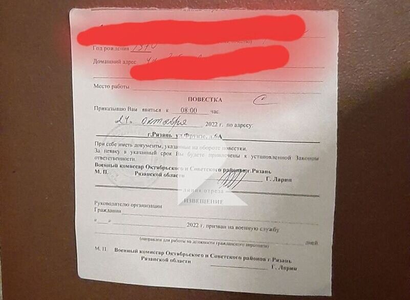 На улице Зубковой повестку, выписанную на имя 52-летнего мужчины, наклеили на дверь квартиры, сообщает Rzn_Life. «На каком основании так выдают повестки и портят чужое имущество? Вернувшись домой, обнаружила данное письмо на двери», – возмутилась жительница Рязани. Добавляйте YA62.ru в свои источники в «Дзен-новостях»