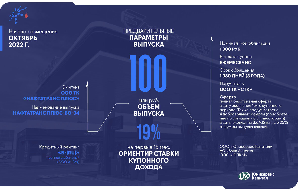 Московская Биржа зарегистрировала четвертый выпуск биржевых облигаций ООО ТК «Нафтатранс плюс» под номером 4B02-04-00318-R от 21.10.2022. ООО ТК «Нафтатранс плюс» — хорошо известная на публичном долговом рынке компания. Новый выпуск для эмитента станет уже четвертым. Напомним, что с 2019 года, нефтетрейдер разместил 3 выпуска биржевых облигаций на общую сумму 870 млн рублей. На сегодня объем бумаг в обращении составляет 786,6 млн руб., так как эмитент осуществляет частичное досрочное погашение по выпуску серии БО-02 ежеквартально в размере 6,67%, начиная с октября 2021 г. Выпуску серии БО-04 присвоен номер 4B02-04-00318-R от 21.10.2022. Предварительные параметры: объем выпуска — 100 млн руб., номинал одной облигации — 1 000 руб., ориентир ставки — 19% на первые 15 купонных периодов, общий срок обращения — 3 года. На момент окончания 15-ого купонного периода запланирована безотзывная оферта с пересмотром ставки купона. Также предусмотрены 4 добровольных оферты в даты окончания 3, 6, 9