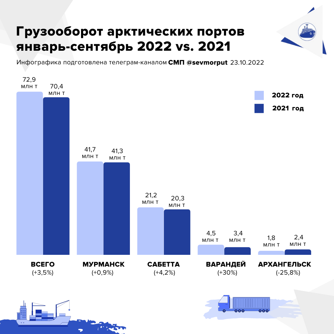 Грузооборот морских портов Арктического бассейна по итогам девяти месяцев 2022 года стабилизировался и на фоне санкционных ограничений показывает скромный, но уверенный прирост. За январь-сентябрь 2022 года арктический грузооборот по сравнению с аналогичным периодом прошлого года подрос на +3,5% и составил 72,9 млн тонн. При этом в целом по России показатель уменьшился на 0,5%. Арктические порты продолжают демонстрировать самый высокий прирост грузооборота по стране. Драйвером роста являются наливные грузы — 51,7 млн тонн (+7,3%). При этом зафиксировано падение объема перевалки сухих грузов —21,2 млн тонн (-4,7%). Показательно, что почти все северные порты наращивают грузооборот. Традиционный лидер по объемам Мурманск добился результата в 41,7 млн тонн (+0,9%), далее следует Сабетта — 21,2 млн тонн (+4,2%) и Варандей — 4,5 млн тонн (+30,0%). Стоит отметить, что в порту Мурманска доля зарубежных перевозчиков сократилась примерно на 40%, однако падения грузоперевозок не случилось — все г