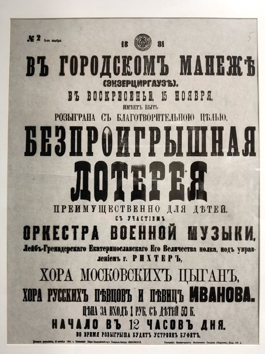 Беспроигрышная лотерея будет розыграна преимущественно для детей, но зато сопровождается прекрасной концертной программой! Тут вам и Оркестр военной музыки, и Хор цыган, и Хор русских певиц и певцов Иванова! А во время розыгрыша будет устроен Буфет!!!) Цена всего 1 рубль, а с детей и того меньше — 50 копеек. Событие будет 15 ноября. Ой, оно уже прошло в 1881 году))). В фойе выставочного зала Манеж представлена выставка "Исторические афиши" из собрания государственного исторического музея Экзерциргаузъ И первое, на что обращаешь внимание — это то, что на некоторых афишах мы видим не привычное слово Манеж, а Экзерциргаузъ! Экзерциргауз (воен.) — крытое помещение для военных упражнений в холодную и ненастную погоду В представленных афишах название Экзерциргауз фигурирует в 1881 и 1882 годах. Зачастую писали оба названия. Одно из них помещалось в скобки. 26 и 27 декабря 1881 года состоятся 4 Блестящих праздничных гуляния! А блестящие они видимо из-за сильного электрического освещения д