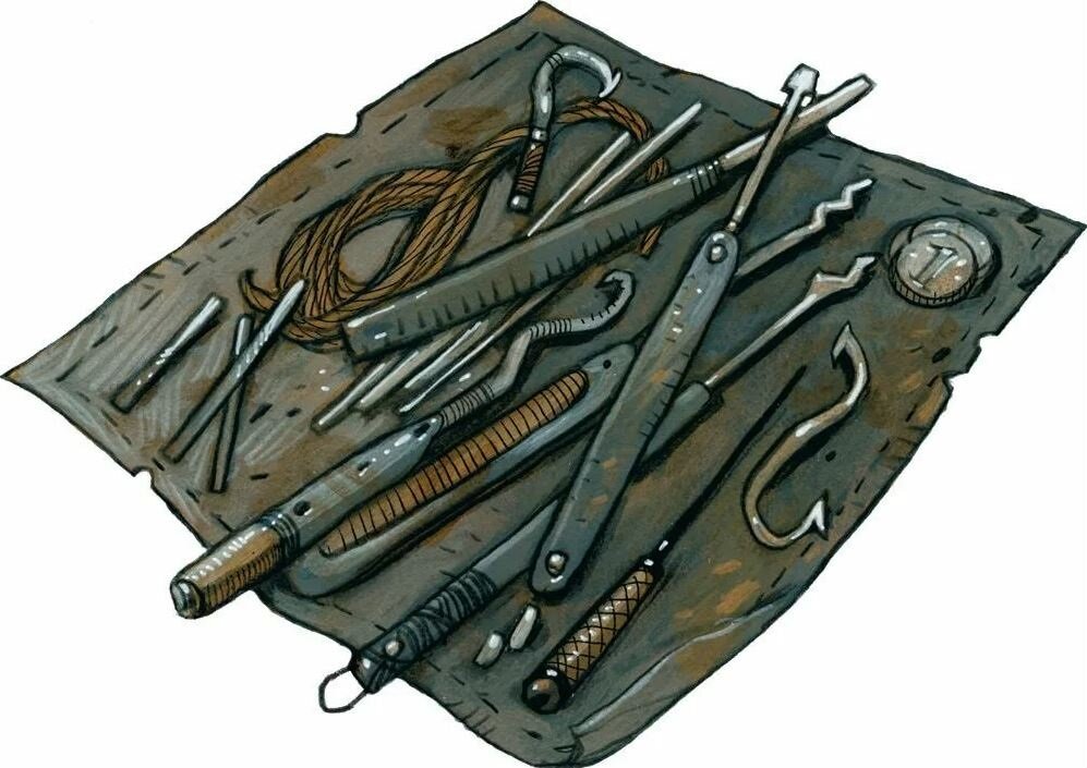 Воровские инструменты, возможно наиболее часто используемые искателями приключений инструменты, разработаны для взлома замков и обезвреживания ловушек. Владение этими инструментами также даёт вам общие знания о принципах действия ловушек и замков.