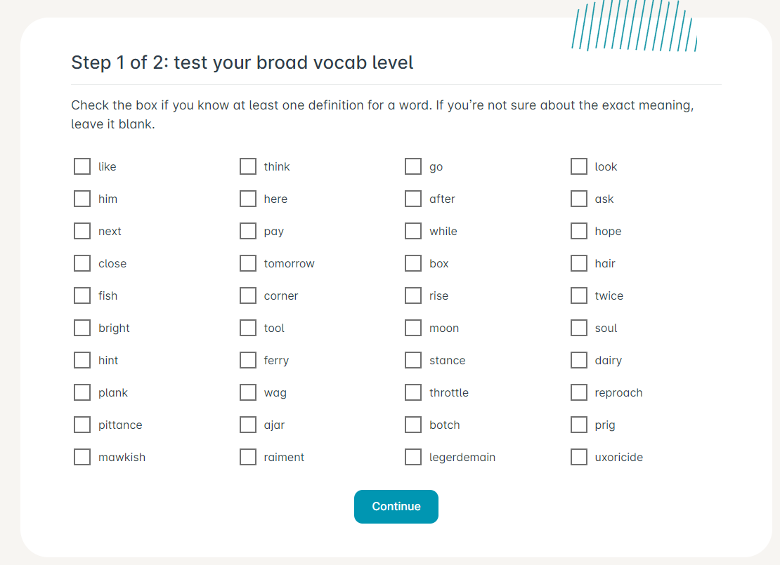 Мы уже рассказывали, как узнать свой уровень языка в одной из предыдущих статей. Однако уровень языка складывается из множества различных факторов - знание и умение применять грамматические правила, способность воспринимать речь в письменном виде и на слух и словарного запаса. Для эффективного изучения языка нужно работать над всеми этими аспектами. Сегодня поговорим собственно о словарном запасе. Перед тем как начать над ним работать нужно понять, на каком уровне вы сейчас находитесь. Сейчас расскажем, как это сделать. Предлагаем вам пройти быстрый онлайн-тест на словарный запас. Для начала переходим по этой ссылке. На открывшейся странице отмечаем галочкой все знакомые слова. Затем нажимаем "Continue". На следующей странице делаем то же самое. В итоге на третьей странице вы увидите свой результат. В среднем носитель языка знает от 20000 до 35000 слов. И так, после того, как вы узнали размер своего словарного запаса, можно приступить к его расширению. Как это сделать? Самым правильны