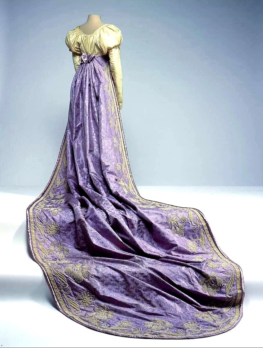 Вышивка указывает на королевское происхождение одежды: в Cérémonial de l'Empire Français от 1805 года говорится, что все дамы, допущенные ко двору, носят одежду той же формы, что и у императрицы.Если дамы предпочитают иметь вышитую кайму, она не может превышать 10см в ширину.