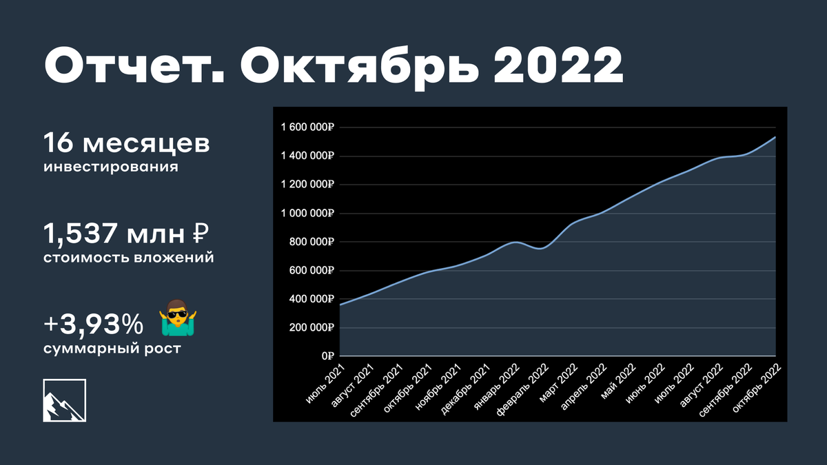 1 ноября, значит пора убирать летнюю одежду и подвести итоги дождливого октября! Я вас, во-первых, приветствую! Ежемесячно я пишу отчет о том, что произошло по моим инвестициям и другим моментам. Напоминаю: я начал копить на квартиру в Сочи в июле 2021. 16 месяцев позади. Погнали!