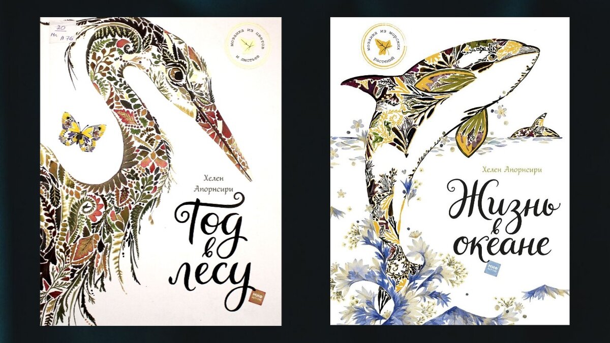 Сегодня речь пойдет о познавательных шедеврах Хелен Апорнсири, а именно о книгах «Год в лесу» и «Жизнь в океане». Книги выпущены в серии «МИФ детство», но будут интересны и взрослым любителям цветочных орнаментов. Меня, как читателя, в первую очередь привлекли иллюстрации. На обложках видны крупные силуэты цапли и косатки, искусно собранные из мелких листиков и цветов, украшенные золотыми линиями. Сначала я думала, что эти невероятно детализированные растения – акварельное мастерство иллюстратора. Но в конце книги сама художница комментирует процесс создания животных образов: «Иллюстрации в этой книге выполнены без единой капли краски. Водоросли, прибрежные травы, кое-какие садовые растения – все это было собрано на Южном побережье Англии». То, с каким мастерством скомпонованы эти изображения, лично меня приводит с неописуемый восторг. Даже тончайшие линии – это какая-нибудь веточка или жгутик. Отвекусь от книги, добавлю, что у этой изобразительной техники есть название: Осибана или п