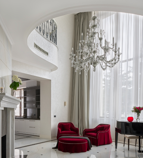 Плавные линии архитектуры поддерживают мебель и черный рояль в центре гостиной. Многоярусная люстра в классическом стиле продолжает вертикаль оси, вокруг которой закручена парадная лестница и графичная ковка ограждения на втором этаже.