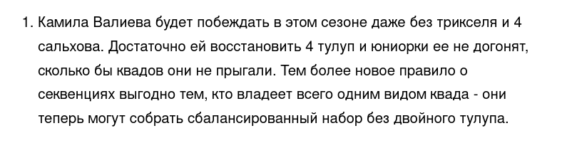 В статье с разбором произвольных многие читатели удивлялись, как это так вышло, что по моим подсчетам Камила с чистыми программами без ультра-си должна побеждать Софью Акатьеву с двумя трикселями и "уроненным" 4 тулупом.