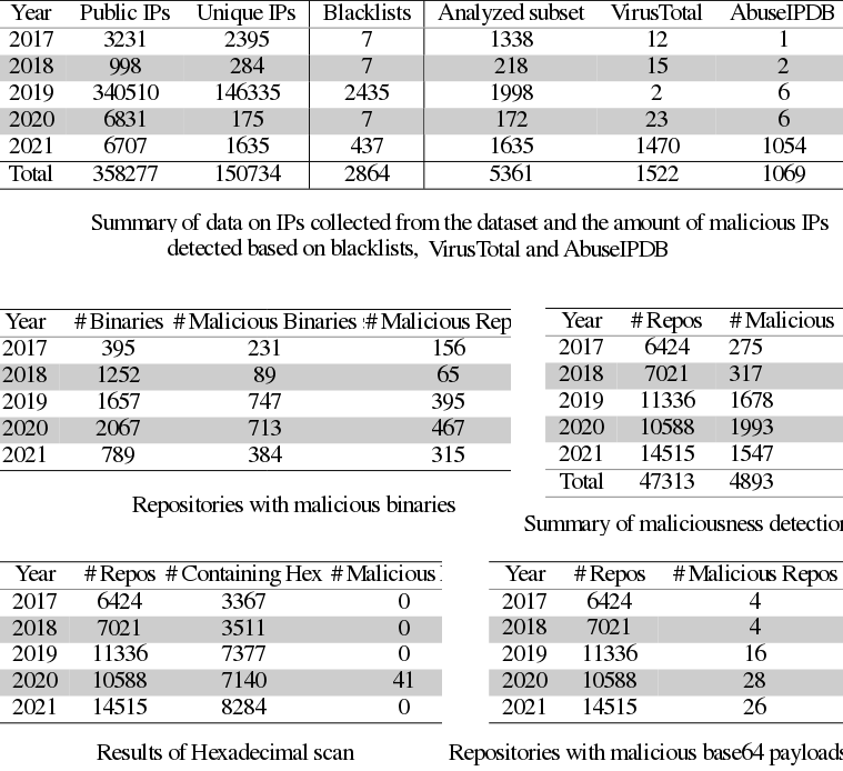 - Код эксплоитов анализировался на наличие вшитых публичных IP-адресов, после чего выявленные адреса дополнительно проверялись по базам с чёрными списками хостов, используемых для управления ботнетами и распространения вредоносных файлов.